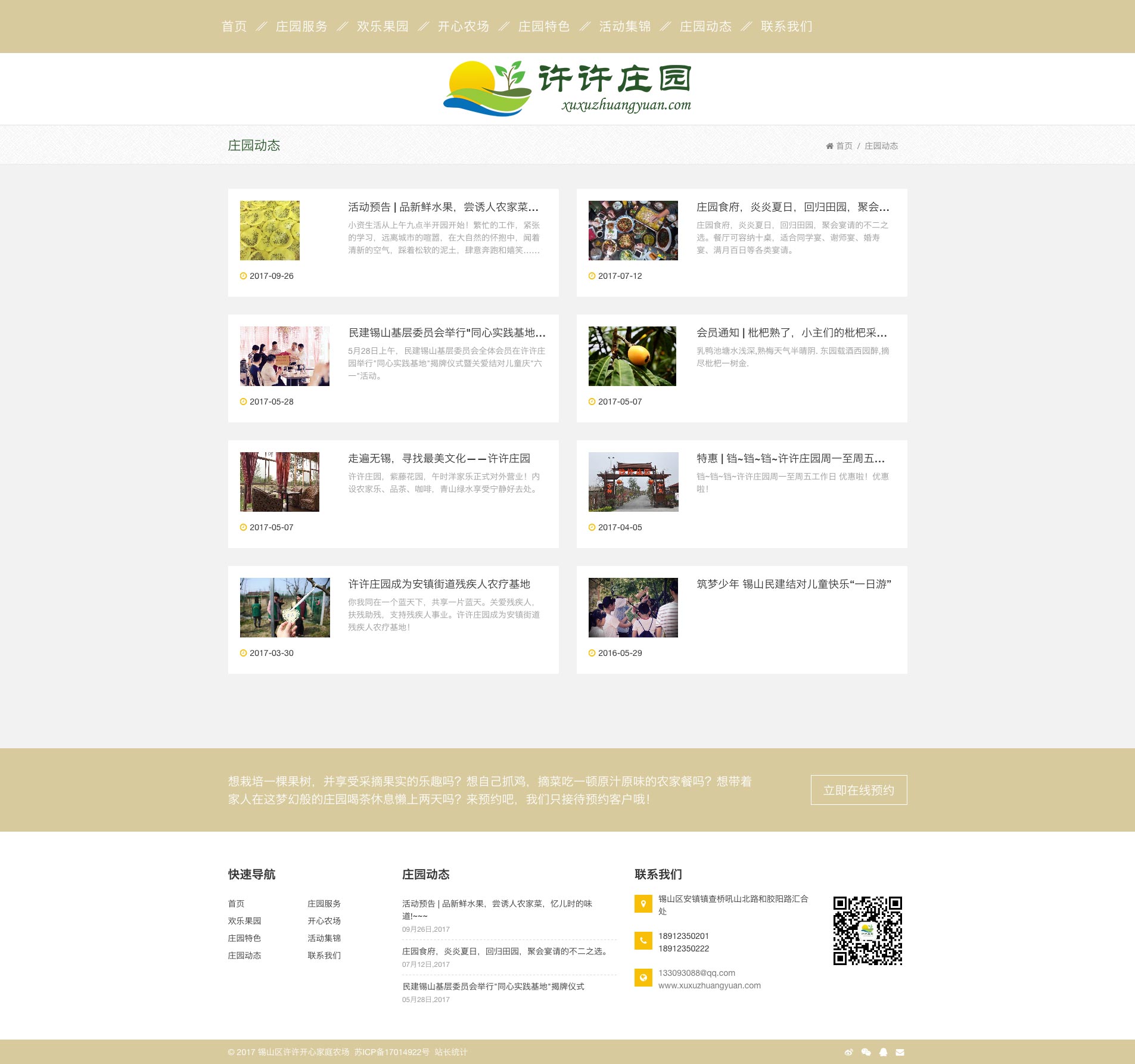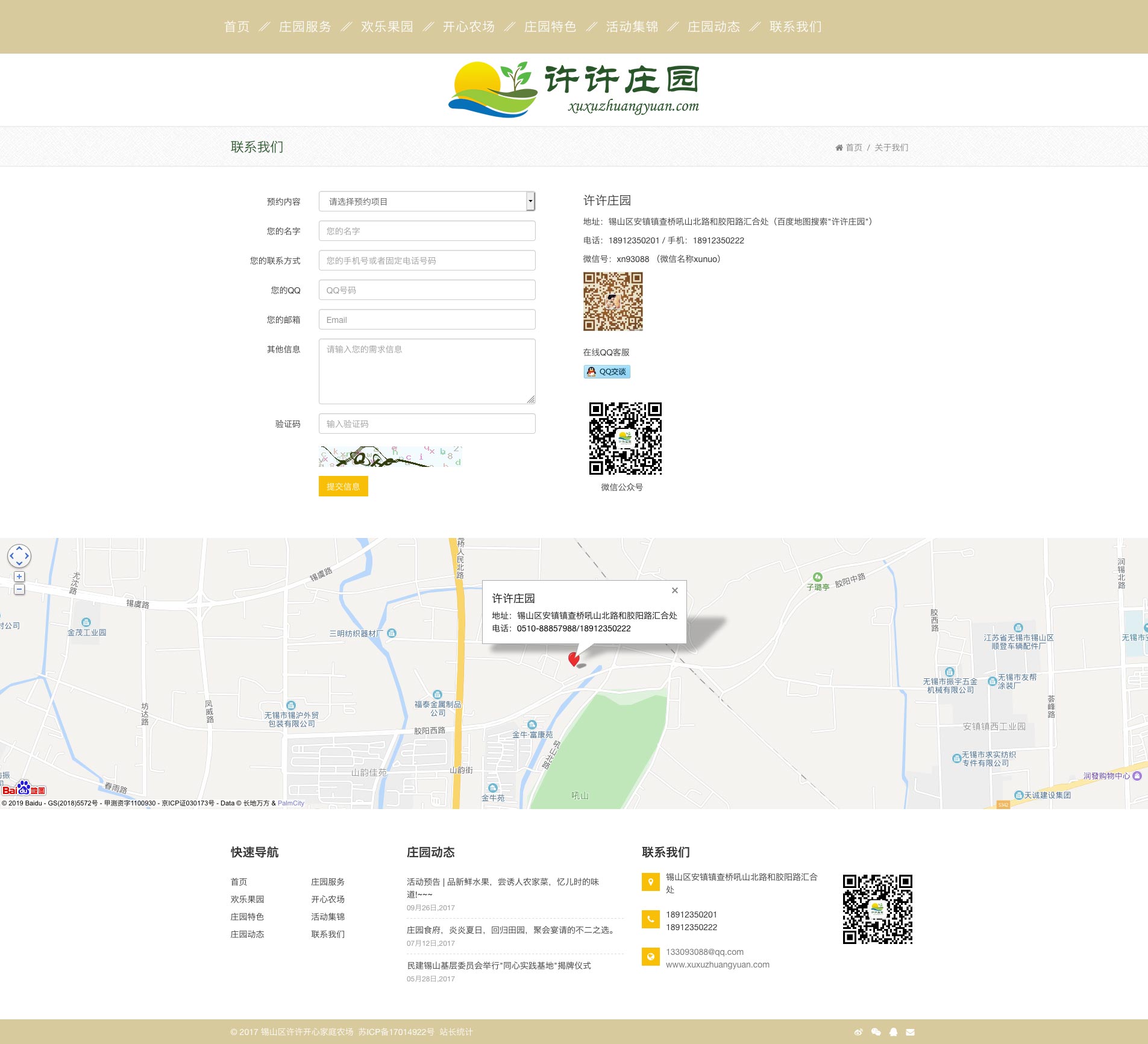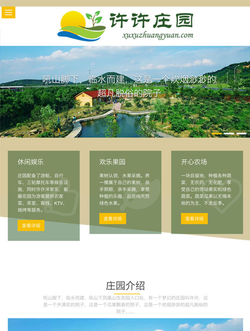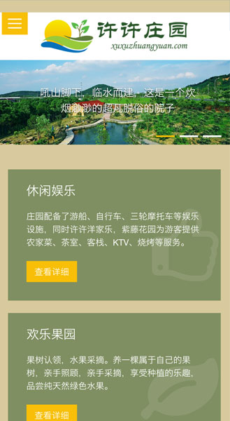 农家乐,庄园网站,响应式,支持手机/电脑/pad。包括文章页,列表(两种),图文单页,带动态地图联系页。支持在线留言、推送邮箱、短信等功能。